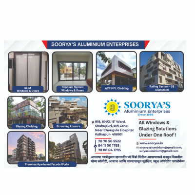Sooryas Aluminium Enterprises is a leading fabricator and facade contractor in Kolhapur, established in 1986. They specialize in providing complete architectural aluminium and uPVC solutions for residential and commercial spaces. Contact and Location Address: 818, KH/2, 5th Lane, Shahupuri, Near Maruti Mandir, Beside Chougule Hospital, Kolhapur, Maharashtra, 416001. Phone Numbers: +91 95791 11191, +91 78880 41795, +91 90671 55994, +91 70705 05522. Website: www.sooryas.in. Email: sooryasaluminium@gmail.com. Business Information Year of Establishment: 1986. Legal Status: Partnership. CEO/Partner: Rajan Tandale and Harshad Tandale. Business Hours: Monday - Friday: 10 AM - 7 PM. Saturday: 10 AM - 6 PM. Sunday: Closed.